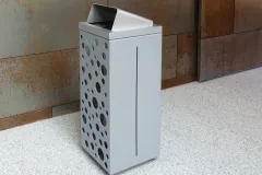 Ein Box Bin ist aus dickwandigem Cortenstahl. Er wird mit einem Dreikantschlüssel verriegelt. Aufgrund der verschiedenen Ausführungen sind mehrere Kombinationen möglich: in Cortenstahl oder mit pulverbeschichtetem Stahl, mit oder ohne Muster und mit einer Abdeckplatte oder einer Regenhaube aus Edelstahl oder Cortenstahl.