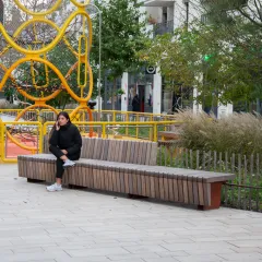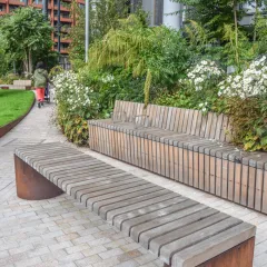 Die Bank mit quer ausgerichteten Solid Latten ist vorne im Beinbereich mit einer Schürze versehen. Die geschlossenen Gestelle sind aus verzinktem Stahl. Die Solid Skirt Crosswise Bank lässt sich unsichtbar an Erweiterungsmodule koppeln, wobei der Rhythmus der Latten ununterbrochen fortgesetzt wird.