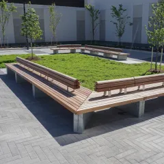The hot-dip galvanised supports can easily be anchored invisibly to the ground and are optionally available in Corten or RAL powder coated steel. With the special connection units, long bench configurations can be realised. Various backrest models complete the Solid Series.