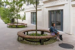 The benches have an open center, giving them a lightweight appearance. The radial arrangement of the slats provide a natural anti skate solution. The benches come in 7 different diameters ranging from 59" to 157". A luxurious look can be created by adding the Vertical Backrest. When the circular bench is placed around a tree, it provides protection for the tree as well as a pleasant seating area. The Solid Circular Bench is available in hardwood and in the recycled TWIN material Cloudy Grey.