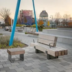 Contrairement aux bancs standard H-H, dont le piètement est dissimulé par les poutres, le piètement des bancs H-H Industry est visible jusqu’à mi-hauteur. La fixation des poutres laisse apparaître les écrous du système Streetlock®. Le système Streetlock® en inox prolonge leur durée de vie, car il permet, même après 10 ans, de retourner ou de remplacer les pièces en bois. Un piètement de jointure permet de connecter deux bancs pour une assise extra-longue. Les piètements sont réalisables en acier galvanisé, en acier Corten ou en acier thermolaqué.