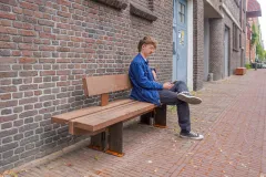 Ce banc, fabriqué à partir de palplanches d'Azobé recyclées provenant d'ouvrages hydrauliques, se distingue par ses lignes épurées et ses détails apparents en rainure et languette.*
