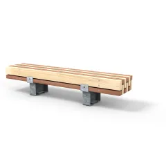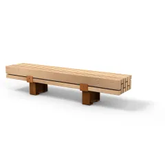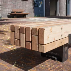 Door herverwerkt hout en jukken uit ons Take Back-programma te combineren, toont de Calico Bank een speels materiaalcontrast. Strategisch geplaatste afstandhouders van gerecycled plastic zorgen voor ventilatie, effectieve waterafvoer en langdurige duurzaamheid.