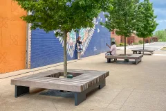 De Rough&Ready balken zijn opgenomen in een plaatconstructie en bevestigd met het Streetlock® Systeem. De Carré Banken zijn prachtig te plaatsen rondom stedelijke bomen, waarbij bescherming wordt geboden voor de bomen en tegelijkertijd veel zitgelegenheid wordt gecreëerd.