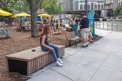 De eindplaten aan beide zijden maken een gesloten, massieve bank van repeterende segmenten. De staanders lopen licht naar binnen toe en hebben een fraai gedetailleerde verbinding met het zitvlak. De houten segmenten zijn in een Streetlock®-kam gepositioneerd. Het stalen onderstel alsook de twee eindplaten kunnen verzinkt of in RAL-kleir gepoedercoat uitgevoerd worden.