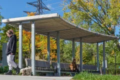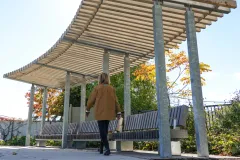 Dit levert een zwevend ruimtelijk beeld en groter vrije vloeroppervlakte op. De Rough&Ready Curved Hover Shades zijn een modulair systeem op basis van houten balken en behoren tot de Rough&Ready Productrange van Streetlife. Op fraaie en slimme wijze zijn deze balken bevestigd aan dikwandige StreetLock®-kammen, welke een integraal onderdeel van de constructie vormen. De staalconstructie is zowel thermisch verzinkt als gepoedercoat verkrijgbaar.